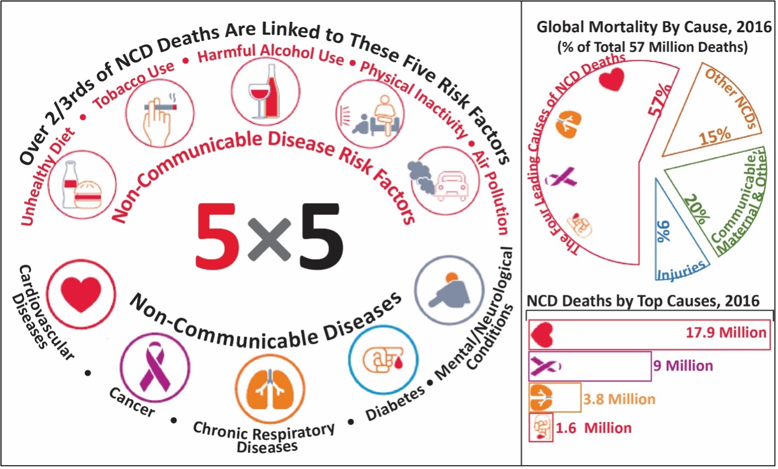 In 2011, the United Nations General Assembly Heads of State issued a political declaration committing the world to addressing the four leading risk factors for the four leading NCDs. This call for action on unhealthy diets, tobacco use, harmful alcohol use, and physical inactivity aims to prevent death and disability from cardiovascular diseases, cancer, chronic respiratory diseases, and diabetes. In 2016, 71% of total deaths were caused by NCDs, and 57%, over 32 million, were caused by just these four leading NCDs – see Fig. 1 below (WHO 2018a). In 2018, a subsequent meeting of the UN General Assembly Heads of State resulted in a new political declaration that added a new risk factor, air pollution, and a new NCD, mental/neurological conditions (UN Interagency Taskforce 2020). The 5 priority risk factors and NCDs are listed below (Fig. 1).