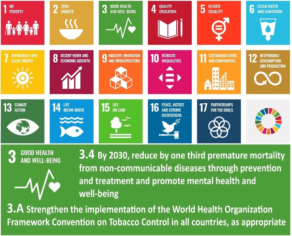 At the 2011 UN High-Level Meetings on the prevention and control of NCDs, the world committed to a reduction in mortality from four leading NCDs (WHO 2019c). Subsequently, the WHA adopted a set of NCD and risk factors targets, including a 25% relative reduction in premature mortality (ages 30–70 from the four leading NCDs). In the context of this increasing prominence on the international agenda, SDG 3.4 elevated action on NCDs with recognition of substantial progress on their prevention and treatment as essential to development and social equity. The specific aim under SDG 3.4 is reduction by one-third of premature NCD mortality with a focus on the leading NCDs (cancer, cardiovascular disease, chronic respiratory disease, and diabetes). Key to this goal’s achievement are the commercial determinants of health, in particular tobacco use (WHO 2019c). Uniquely, the WHO FCTC is specifically cited with target 3.A calling for all countries to strengthen the Convention’s implementation. Although other legal instruments are implicitly evoked by and interlinked with the goals, the WHO FCTC is the only international treaty specifically referenced, let alone made its own target, in the SDGs and its inclusion reflected the growing priority of tobacco control in the international agenda. Target 3.A is to be achieved by reductions in tobacco use prevalence. Similarly, target 3.5 calls for reducing per-capita alcohol consumption by volume.