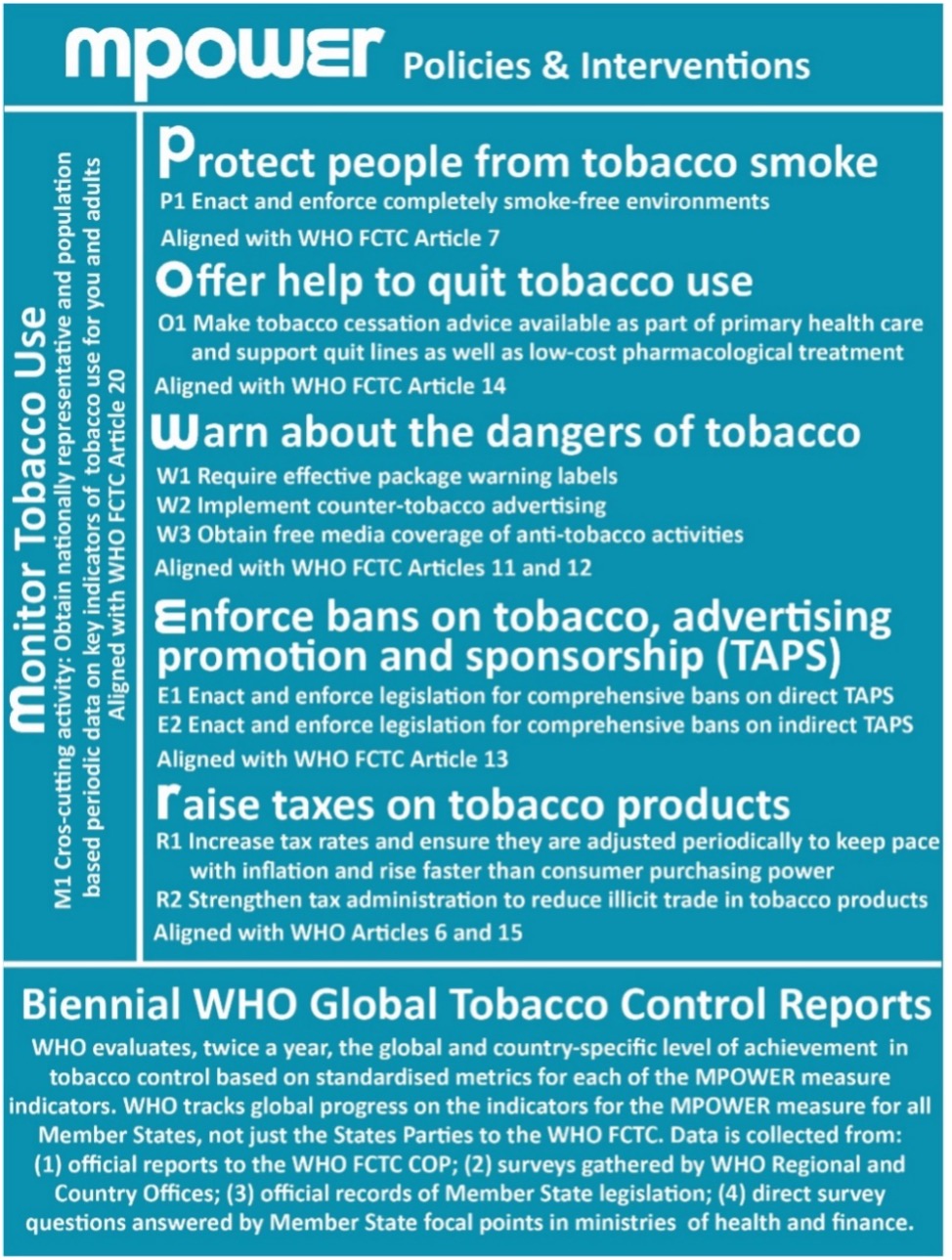 Fig. 13 (Adapted from WHO 2008): MPOWER measures, indicators, and tracking.