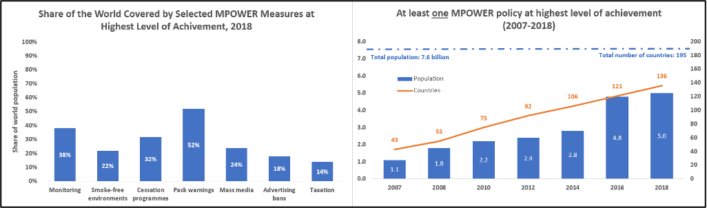 MPOWER is an evidence-based technical package to help countries implement evidence-based demand reduction measures for tobacco control – in line with the WHO FCTC’s – developed by WHO and released in 2008 with Bloomberg Philanthropies’ support. The MPOWER technical package’s implementation is critical to recent and prospective success on tobacco control. There is a seamless relationship between the WHO FCTC and the MPOWER technical package: while the WHO FCTC is the definitive baseline for all tobacco control work, MPOWER provides the gold standard for achievement in implementing the WHO FCTC’s reduction measures. It calls for monitoring tobacco use (Article 20), protecting people from tobacco smoke (article 8), offering help to quit tobacco (Article 15), warning about the dangers of tobacco (Articles 11 and 12), enforcement of TAPS bans (Article 13), and raised tobacco taxes (Article 6). Implementation of these measures up to the best practice level is monitored by WHO and the effectiveness of Member State implementation is scored according to the level of achievement based on associated indicators (see Fig. 13, above, for details). Each indicator has a best-practice, highest level of achievement, target which all Member States are urged to work toward. Implementation of MPOWER is monitored for all WHO Member States, not just States Parties to the WHO FCTC. Global and country-specific progress on MPOWER is collated and published once every year two years in the biennial WHO Global Report on the Tobacco Epidemic. As seen in Fig. 14, in 2019, five billion people, 65% of the global population across 136 countries, were covered by at least one MPOWER measure at its highest level of achievement – when all the tracked indicators for an MPOWER measure fulfil certain best-practice conditions (WHO 2019a). This is a more than fourfold increase over 2007 when only one billion people were covered to this level (WHO 2019a). Of these five billion, 3.9 billion live in LMICs and a total of 61% of those living in LMICs are protected (WHO 2019a). These increases in MPOWER coverage and the consequent protection afforded people around the world is a demonstration of the WHO FCTC’s success. Figure 14 also breaks down MPOWER coverage in 2019 by measure. The only two countries to have adopted all MPOWER measures at a full level of achievement are Brazil and Turkey, middle-income countries – see Box 8, below (WHO 2019a).