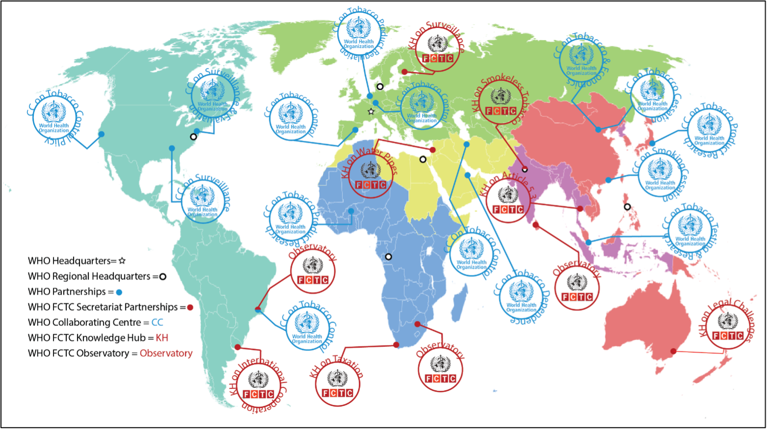 A key role for the Convention Secretariat is supporting the meetings of the COP and MOP, as well as any subsidiary bodies they establish (Zhou and Liberman 2018). In addition, however, the Secretariat tracks and advances implementation of the WHO FCTC and the Illicit Trade Protocol. It advances implementation through policy support to all countries – but in particular to LMICs, as seen in its FCTC 2030 project – and its establishment of partnerships for tobacco control, see more on this in section “Tobacco Control Implementation” (Zhou and Liberman 2018; WHO 2019a). WHO complements the Convention Secretariat’s policy support by providing States Parties with technical support in their implementation of the WHO FCTC and its Protocol’s key measures and reporting requirements through its six regional offices, headquarters, and 147 country offices (WHO 2019f). These country offices were and continue to be instrumental in encouraging and assisting ratification of both the Convention and its Protocol by the WHO Member States in which they are present (WHO 2019f).