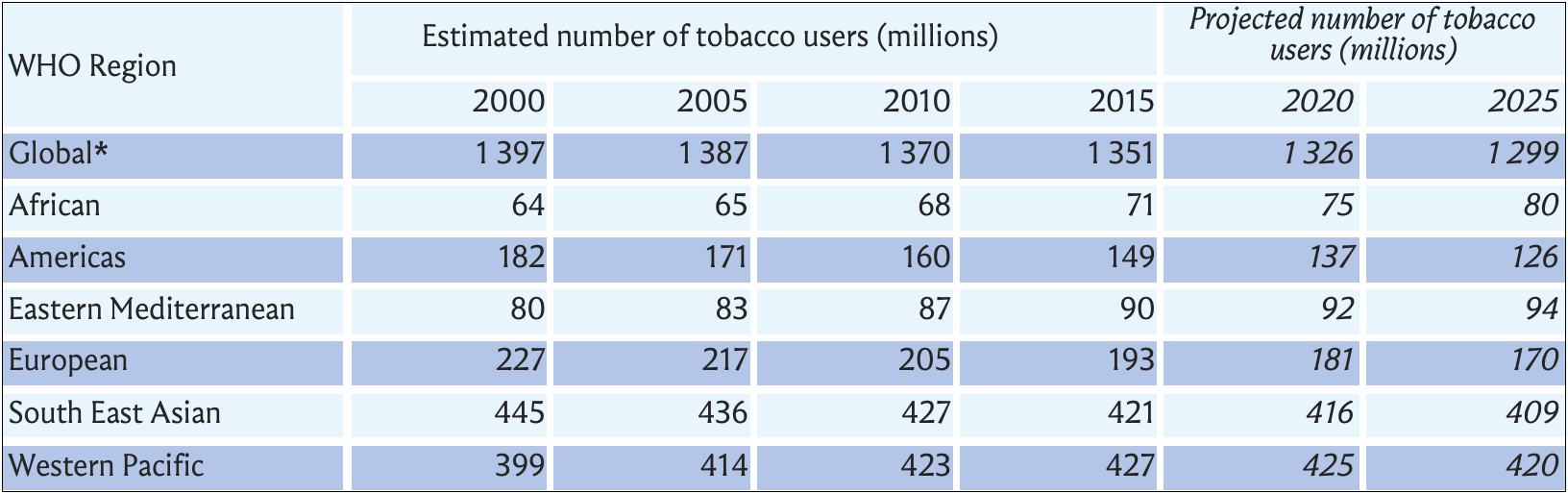 Table 1 (WHO 2019b): Global number of tobacco users.