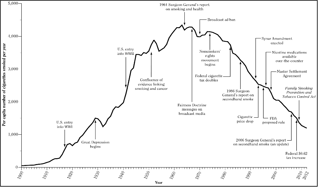 Fig. 2 Adult per capita cigarette consumption and major smoking and health events, United States, 1900–2012 (US Surgeon General 2014)