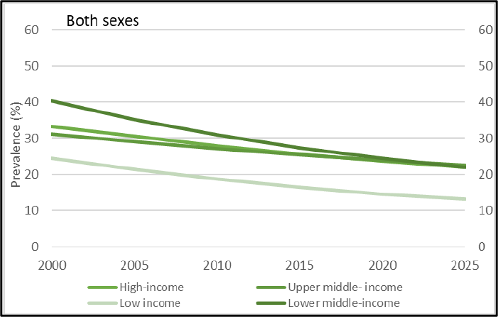 Fig. 3 (WHO 2019b): Trends in global prevalence of tobacco use prevalence among adults by World Bank income group.