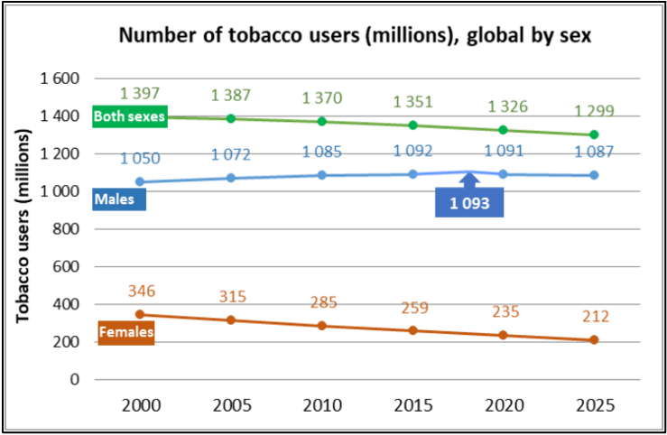 Fig. 4 (WHO 2019c): Trends in the global number of adult tobacco users by sex.