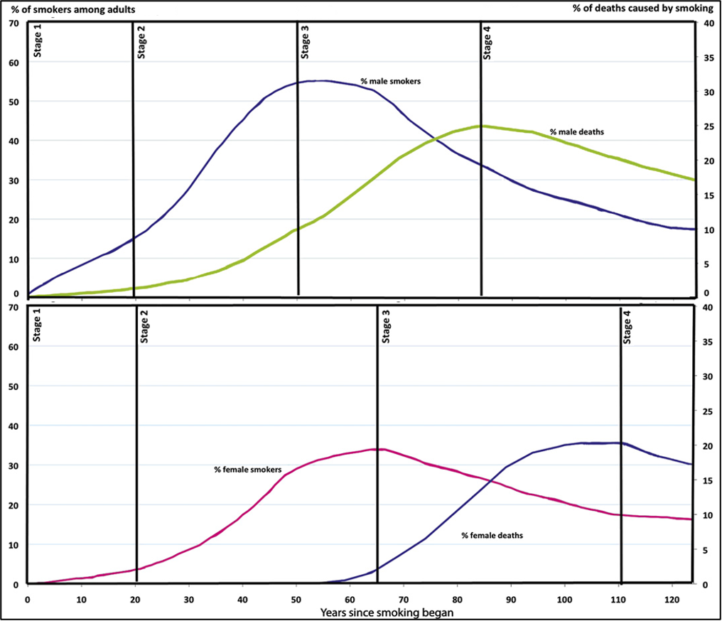 Fig. 5 (Thun, et al, 2012): The gendered stages of the tobacco epidemic in HICs.