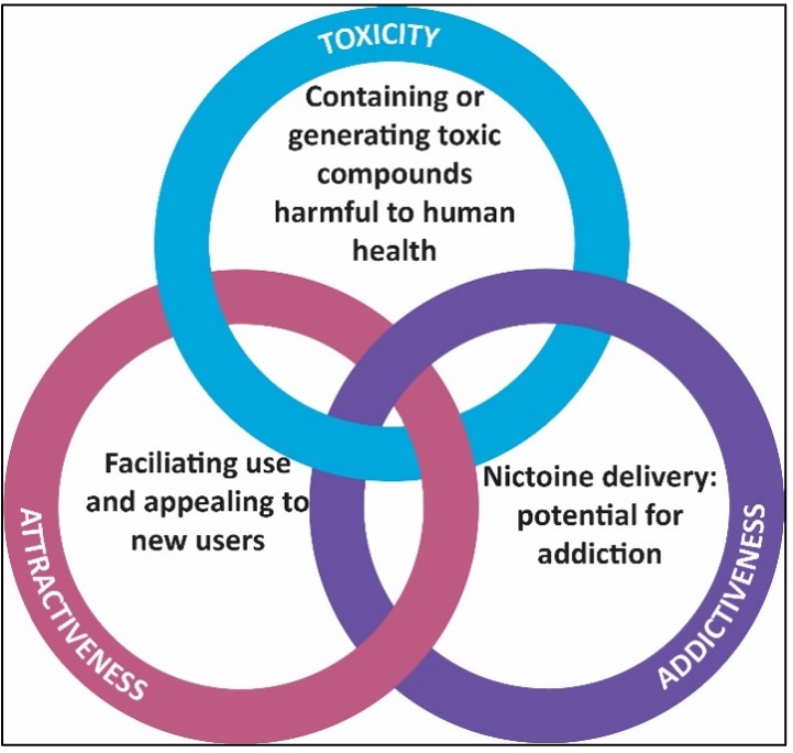 There is a plethora of tobacco products available on several markets globally. These products, which can be broadly categorised into: (1) cigarettes; (2) other smoked tobacco products; (3) novel and emerging nicotine and tobacco products; and (4) smokeless tobacco products, have evolved over the years, with the primary purpose of increasing appeal and sustaining use. The content, emissions, and design features of these products contribute to their appeal, influence consumer use, as well as consumer perception of harm. Thus, these three characteristics of nicotine and tobacco products influence their attractiveness, addictiveness, and toxicity which can vary depending on the product in question and contribute to the negative health consequences elicited by the products – see Fig. 6 (WHO 2018a). It is, however, important to keep in mind that these negative consequences go beyond toxicity, which is often equated to and misrepresented as “harm” to an individual (WHO 2018a). “Thus, reduced exposure to toxicants may or may not translate to better health outcomes” (WHO 2018a). A product’s heightened appeal or nicotine content, which drives addictiveness, may offset any potential benefits from reduced exposure of people to toxic compounds over a longer period of time (WHO 2018a). Importantly, “all forms of tobacco products are toxic, encourage and support use and addiction, and have the potential to cause harm” (WHO 2018a).