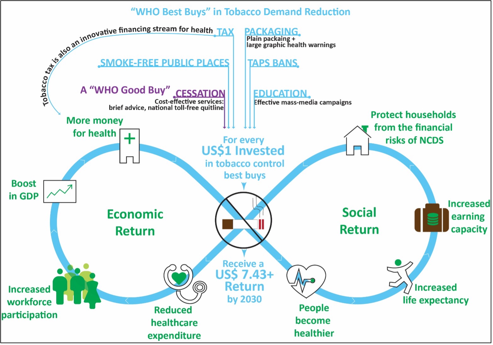 Tobacco control policy measures and public health interventions either reduce the supply of tobacco products or the demand for tobacco products. The World Bank Report, as well as a plethora of evidence since, shows that many of these measures are effective and demand-reduction measures that are particularly effective to reduce tobacco use. Fiscal measures like increased taxes which decrease the affordability of tobacco products is a good example of a highly effective demand-reduction measure (US HHS 2014; NCI and WHO 2016). Other non-price measures like ensuring people know the harms associated with tobacco through mass media campaigns and health warnings on tobacco packaging; bans on tobacco advertising, promotion, and sponsorship; and restrictions on smoking in public places have all been shown to be highly cost-effective and help to prevent people from taking up tobacco use and/or help to convince tobacco users to quit (US HHS 2014; World Bank 1999). Evidence also shows that those who want to quit have much higher chances of succeeding if crucial cessation services are made available to them such as brief advice provided by healthcare workers, nicotine replacement therapies, and national toll-free quitlines (WHO 2019a; US HHS 2014; World Bank 1999). As set out in Fig. 7, below, demand reduction measures are highly cost-effective because they give a strong return on investment due to their low, high-efficacy, and the benefits proven to accrue from reduced tobacco consumption in reduced healthcare costs and stronger economies (Goodchild et al. 2016; WHO 2017; WHO 2018c). WHO has produced guidance setting out “best buy” and “good buy” tobacco control measures that are highly cost-effective. For every US$1 invested in good buy measures for tobacco control, a country can expect a return of at least US$7.43 by 2030 (WHO 2018c). For more, see Fig. 7, below.