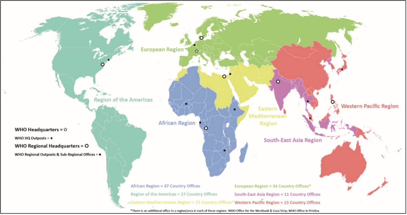 Fig. 8 (Adapted from WHO 2019f): WHO HQ, HQ outposts, regions, regional headquarters, and subregional outposts and offices.