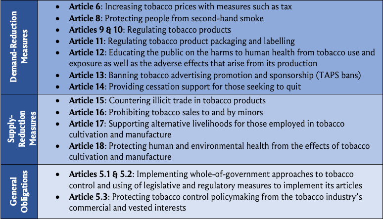 Demand-reduction measures are divided between price measures, at Article 6, non-price measures, Articles 8–13, and finally cessation support, Article 14. Tax, a price measure, is the single most effective intervention for tobacco control and it is appropriately addressed first (NCI and WHO 2016). Price measures other than tax are not explicitly listed but include interventions, such as minimum price floors and prohibitions on discounting (WHO FCTC COP 2014). Non-price measures are diverse, including obligations to ban tobacco advertising, promotion and sponsorships (TAPS), prevent second-hand-smoke (SHS) exposure with smoke free laws, require product regulation and disclosure provisions, and warn the public of tobacco’s harms.